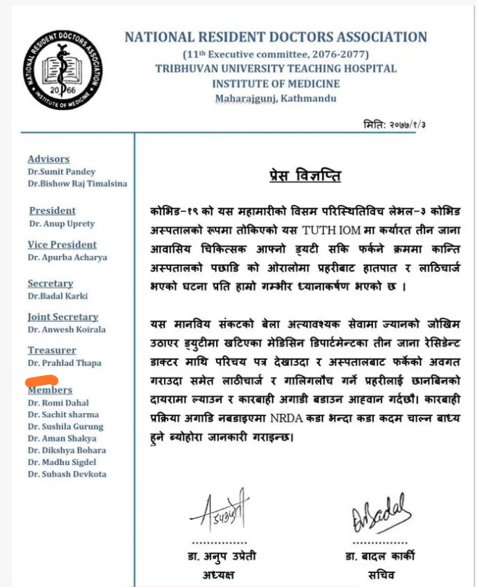 कोरोना भाइरसको महामारीका कारण उत्पन्न हुँदै आएको मानवीय संकटका समयमा चिकित्सकहरुले आफ्नो ज्यानको बाजी लगाउँदै चिकित्सकीय धर्म अनुसार स्वास्थ्य सेवा प्रवाह गरी आफ्नो निवास फर्कने क्रममा परिचय पत्र देखाउँदा समेत केही प्रहरीबाट चिकित्सकमाथी हातपात गर्ने, लाठिचार्ज गर्ने जस्तो अन्यन्तै अमानवीय क्रियाकपालप्रति नेपाल चिकित्सक संघ घोर भत्र्सना र निन्दा गर्दै अबिलम्ब त्यस्ता प्रहरीहरुको छानबीन गरी कानूनी कारवाही गर्न नेपाल चिकित्सक संघ जोडदार माग गर्दछ ।