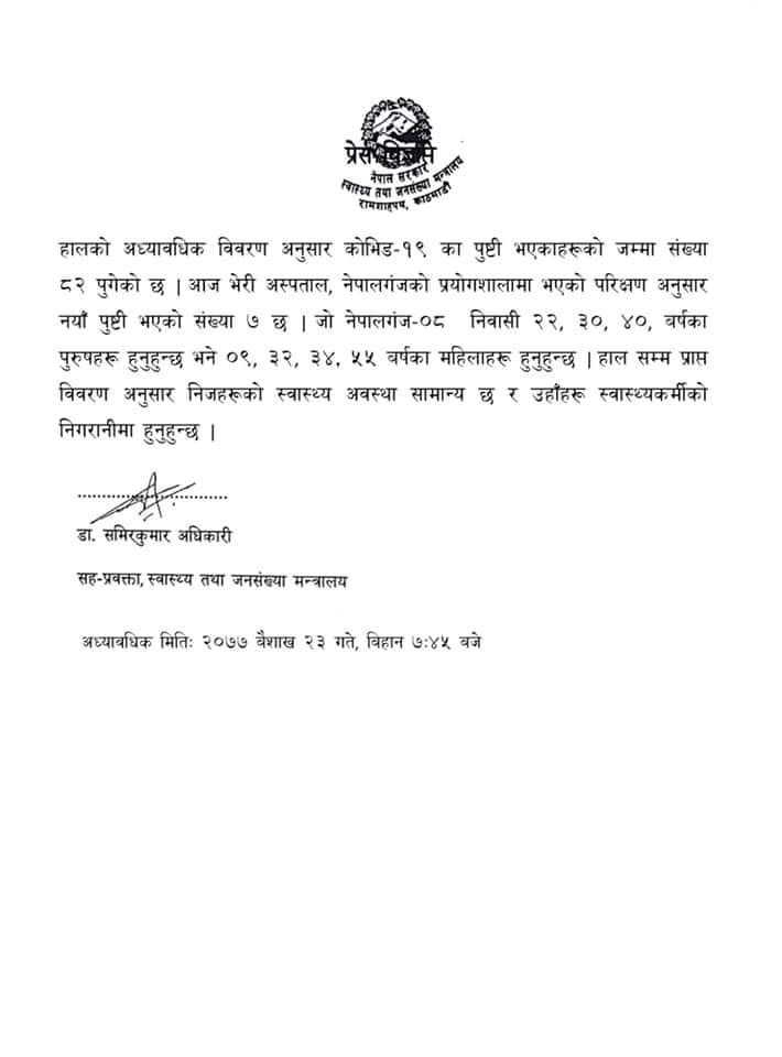 स्वास्थ्य तथा जनासंख्या मन्त्रालयका सहप्रवक्ता डा. समिरकुमार अधिकारीका अनुसार नयाँ संक्रमितहरु नेपालगञ्ज-८ का २२, ३० र ४० वर्षका पुरुष र ०९, ३२, ३४ र ५५ वर्षका महिला रहेका छन्।