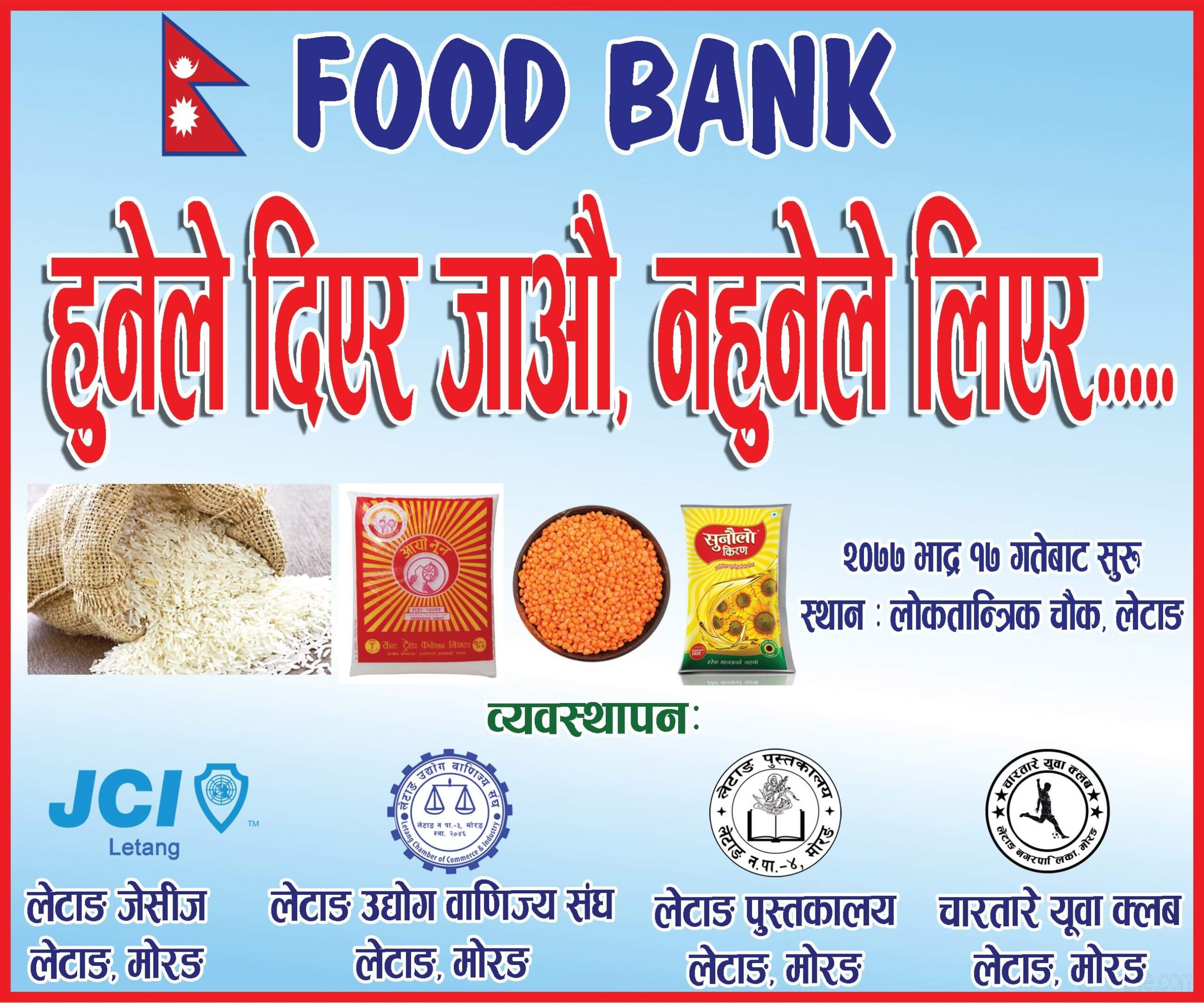 बढ्दाे लकडाउनले सृजना गरिरहेको बेरोजगारीपन बाट खाना खान समेत समस्या भइरहेका परिवारलाई केही राहत हुने गरि भदौ २० गते शनिबार बिहान ९ बजे देखि लोकतान्त्रिक चोक (लेटाङ कम्प्लेक्स अगाडि) लेटाङबाट निशुल्क फुड बैंकको स्थापना गरेर सन्चालनमा ल्याइने उक्त अभियानका अभियन्ता राममणी बरालले बताउनु भयो। सबैको साथ र सहयोग को अपेक्षा सहित यो कार्यक्रमको सुरुवात गरिएको उहाले बताउनु भयो।