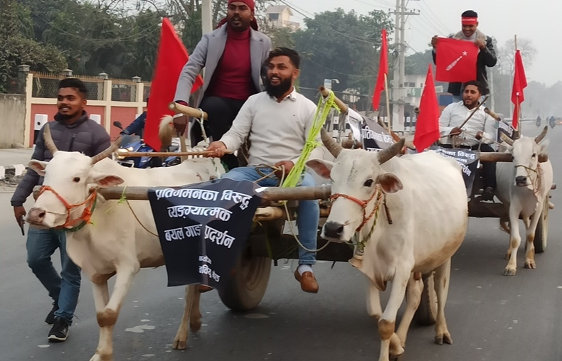 विराटनगर : प्रधानमन्त्री केपी शर्मा ओलीको विरोधमा अनेरास्ववियू मोरङको आयोजनामा आइतबार विराटनगरमा बयलगाडा जुलुस निकालिएको छ। बिराटनगरको रोडशेष चोकबाट निकालिएको जुलुस ट्राफिक चोकमा पुगेर विरोधसभामा परिणत भएको थियो।