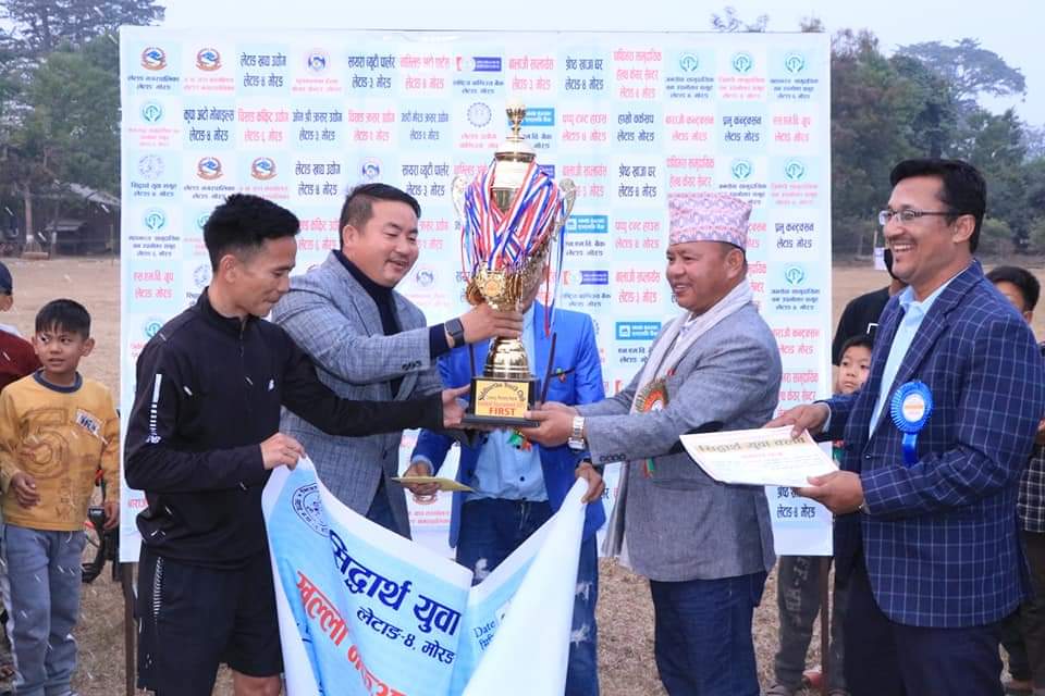 लेटाङ १ फागुन । सिदार्थ युवा क्लव लेटाङ द्धारा आयोजित खुल्ला नकआउट फुटवल प्रतियोगिताको उपाधी सनराईज युनाईटेड क्लव लेटाङले प्राप्त गरेको छ । आज लेटाङ ४ को जनसेवा सामुदायिक बन स्थित फुटवल चउरमा वेलवारी फुटवल क्लव संग भएको प्रतिस्पर्धामा ४—२ गोल अन्तरले विजय भएको हो । खेल अवधीमा दुवै टिमले १—१ गोलको वरावरी खेलेपछि टाईवेकरका आधारमा भएको खेलमा सनराईज विजय भएको हो ।