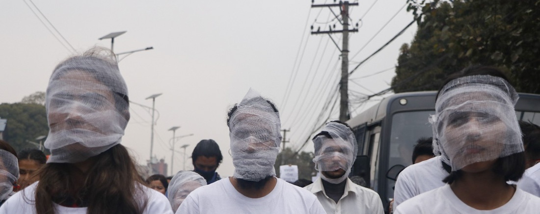 प्रदर्शनकारीहरुले मुखमा पट्टी, हात-खुट्टामा सिक्रीले बाँधेर प्रदर्शन गरेका थिए।