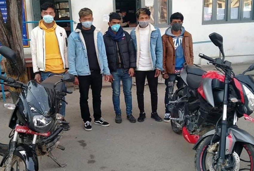 काठमाडौं : महानगरीय ट्राफिक प्रहरी महाशाखाले मोटरसाइकल चोरीमा संलग्न पाँच जनालाई पक्राउ गरेको छ। पीडित सहायता एकाइबाट सादा पोसाकमा खटिएको ट्राफिक प्रहरी टोलीले पक्राउ गरेको हो।