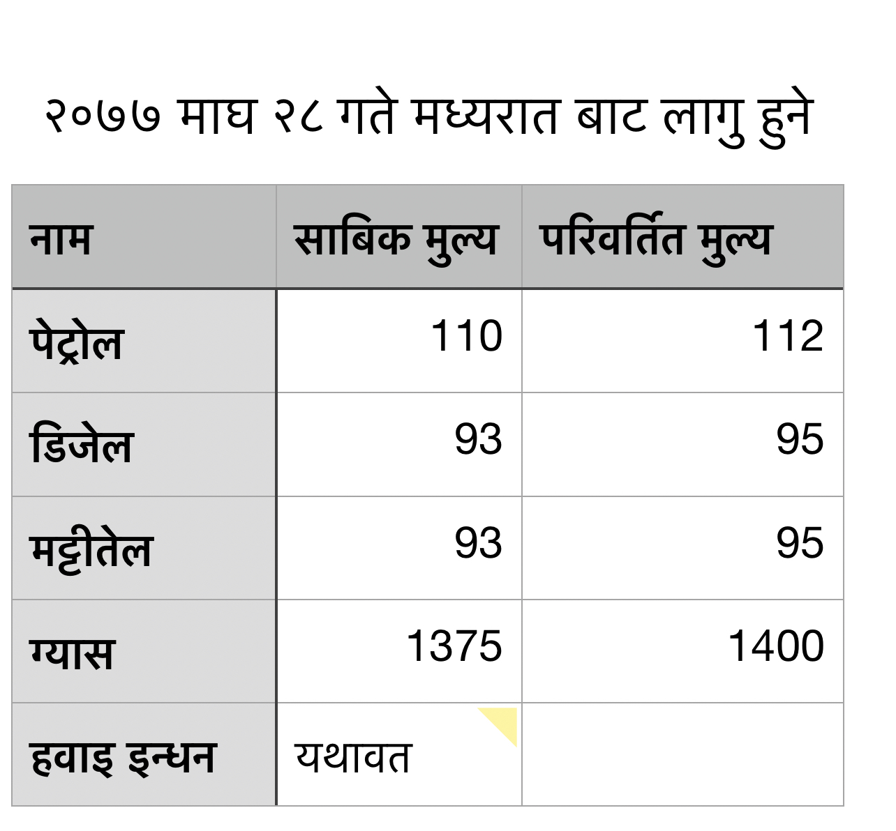 काठमाडौं : नेपाल आयल निगमले बुधबार मध्यरात बाट इन्धनको मूल्य वृद्धि गरेको छ।