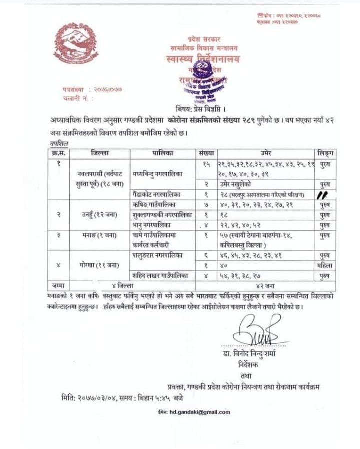 नवलपरासी (बर्दघाट सुस्ता पूर्व), तनहुँ, गोरखा र मनाङमा गरी थप ४२ जनामा कोरोना पुष्टि भएको हो ।