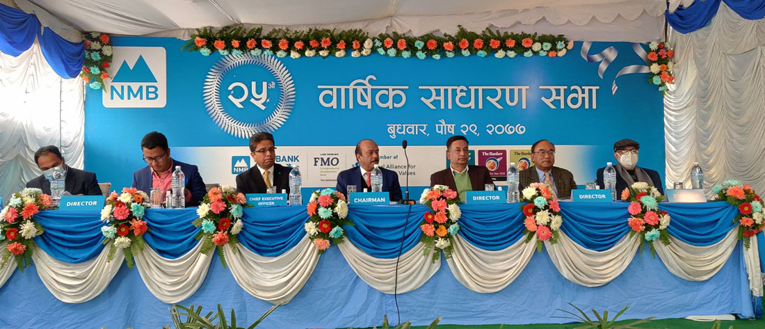 काठमाडौं : एनएमबि बैंकको २५औं वार्षिक साधारणसभा सम्पन्न भएको छ। साधारणसभा भर्चुअल माध्यमबाट सम्पन्न भएको थियो।