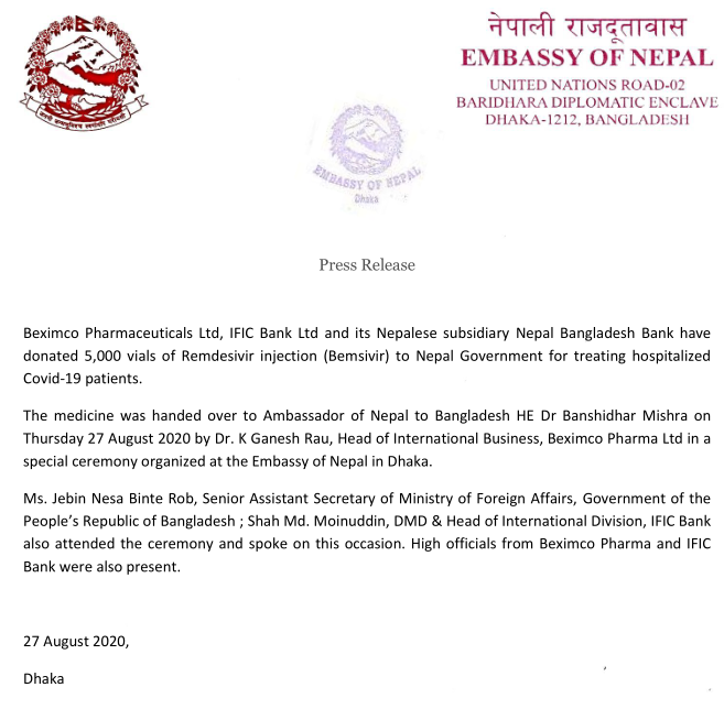 बिहिबार संयुक्त रुपमा बंगलादेशका लागि नेपाली राजदूत वंशीधर मिश्रलाई ढाकामा उक्त औषधि हस्तान्तरण गरिएको थियो ।