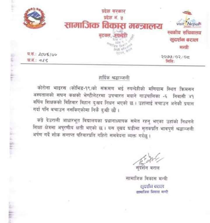 प्रदेश ५ का सामाजिक विकास मन्त्री सुदरर्शन बरालले एक विज्ञप्ति जारी गरी उनको मृत्यु भएकोमा दुःख व्यक्त गरेका छन् ।